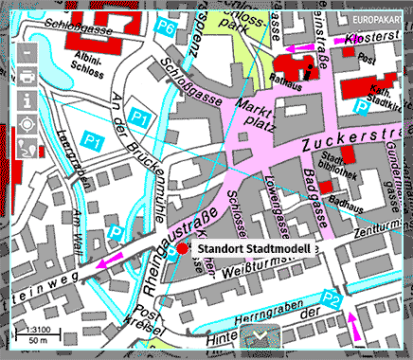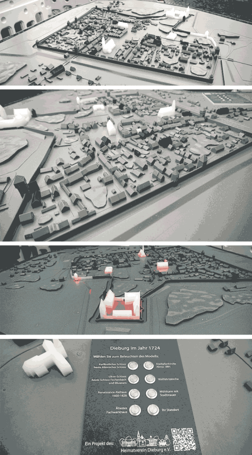 Als der Vorstand des Heimatvereins Dieburg sich dazu entschloss, ein Modell der mittelalterlichen Stadt Dieburg errichten zu lassen, konnte noch keiner aus dem Gremium ahnen, wie schwierig die Planung sein würde. Viele Fragen waren zu klären, viele versierte Menschen mussten an einen Tisch geholt werden und ließen die dabei entwickelten Ideen ineinander fließen und der Verein, vertreten durch den Vorstand,freut sich nun umso mehr über das, was aus einem einfach „so dahin gesagten“ Gedanken entstanden ist. Mit diesem Modell ist es möglich, die Reste der alten Stadt wieder zu entdecken und sich auf einen historischen Spaziergang zu begeben. Hier an dieser, dem Miniatur-Stadtmodell, zugewiesenen Stelle stand einst das alte Stadttor; und auch die Mauerreste zeugen noch von vergangener Zeit.Die Züge der alten Stadtmauer gegenüber lassen uns eintauchen in die Geschichte Dieburgs. So lässt dieses Modell unserer Stadt Vergangenheit und Realität gelungen ineinander verschmelzen. Bedingt durch Vandalismus muss das Stadtmodell mit einer bruchfesten Abdeckscheibe versehen werden.